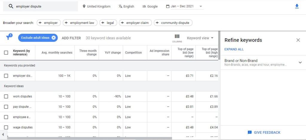 Above, is an example of when I search ’employer dispute’. As you can see, it has provided 30 relevant keywords along with valuable data like; average monthly search volume, the competitiveness of the phrase and the change in searches. This information allows you to understand whether the suggested keywords are valuable to your website. You are not expected to use all 30. Depending on the size of your website/sub-pages, you can use the top 5-10 most relatable. Download the suggestions via the button at the top right and save them to the spreadsheet for future use. Now, do the same for the other sub-services under each seed keyword and you’ll have your list of relevant and useable keywords to grow your organic traffic on your website.