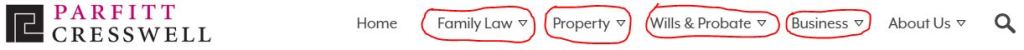 Whilst you can think of your top products/services off the top of your head, it is also beneficial to visit your website and find the pages at the top of your website which users navigate with to find specific products/services. As you can see from the screenshot below, I have highlighted the main services of Parfitt Cresswell (a current SEO client of mine). They offer solicitor services in Family Law, Property Law, Wills & Probate and Business Law. These are what we call the ‘seed keywords’ as they form the pillars for the keyword research.